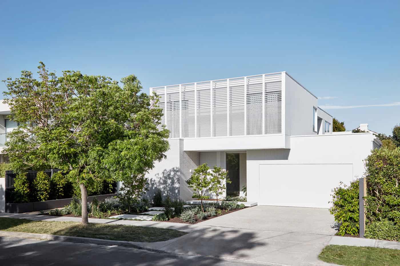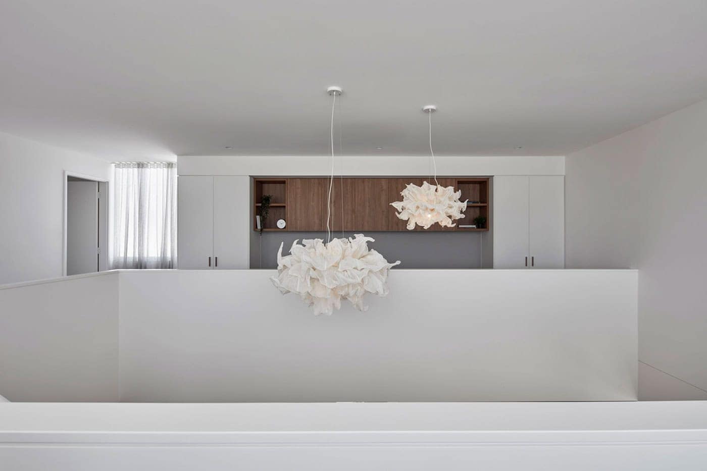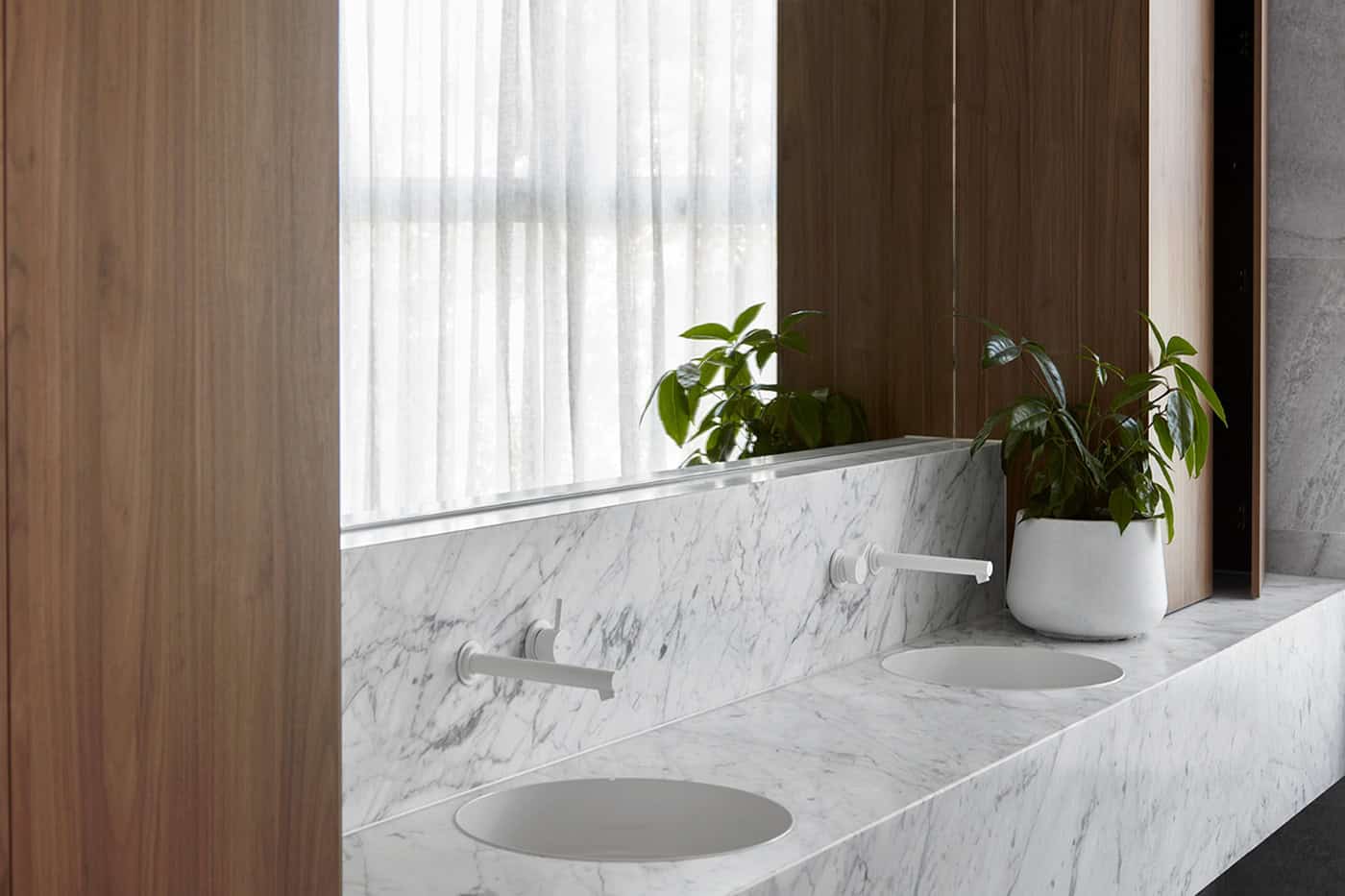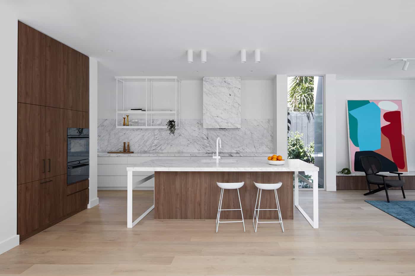 At the heart of the home, beyond the feature staircase, you will find an immaculate kitchen built by TKDC, complete with Carrara marble surfaces, V-Zug appliances, integrated Whispair rangehood and integrated Fisher & Paykel fridge. The Australian-made Scala tapware and Franke sinks carry on the white-on-white theme from the façade, telling a story of light and space. Caramel-toned cabinetry in Notaio Walnut Woodmatt by Polytec is fitted with soft-close hinges by Blum and finger pulls, create a handleless solution for sleek, uninterrupted design. An impressive butler’s pantry, chic built-in bench seat and easy access to the laundry provide comfort of use and standout modern design.