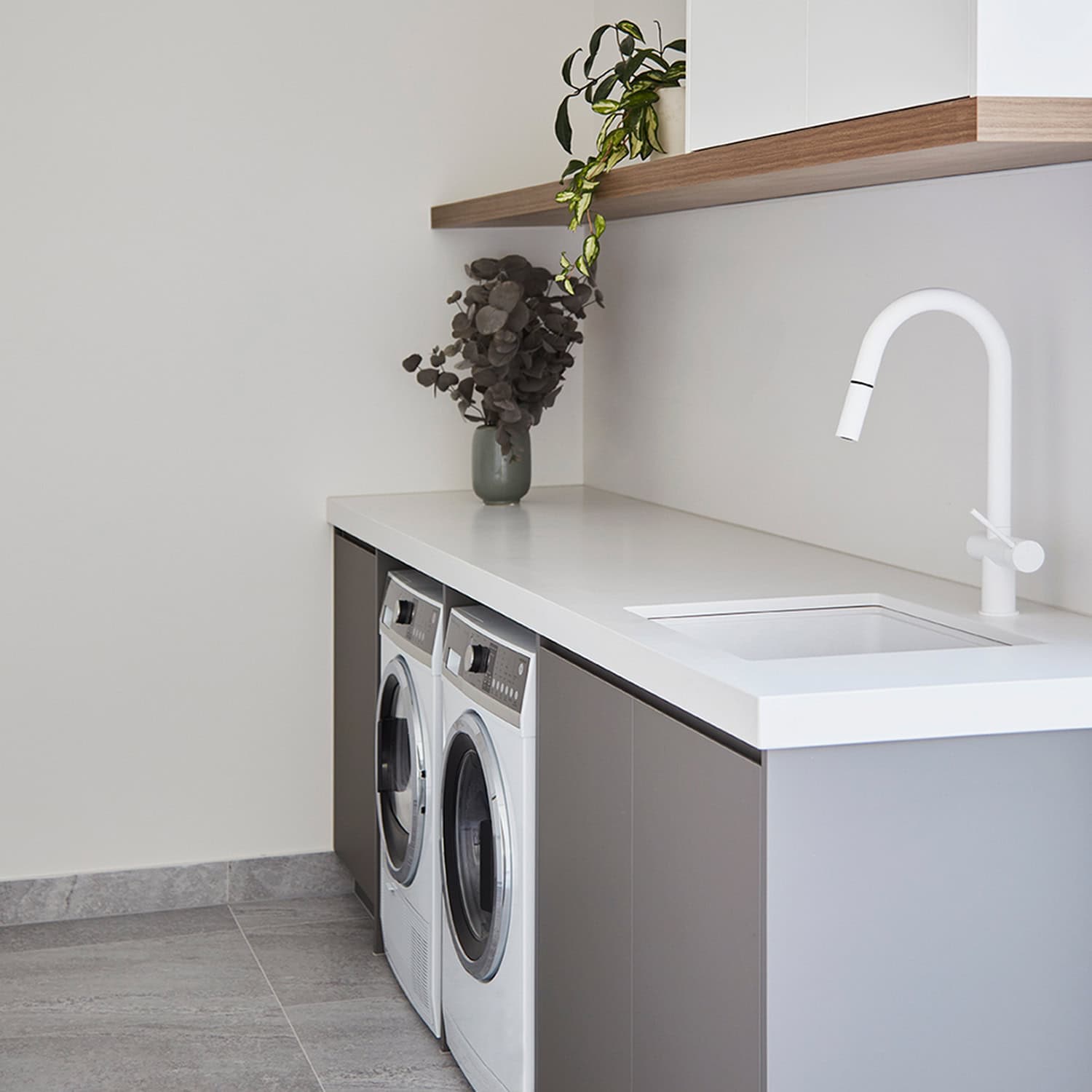 Designed by Webster Architecture and built by Mazzei Homes, the Collis home boasts a striking white façade that gives the house a clean, sophisticated, and timeless quality. As you enter, every cabinetry detail is carefully considered, having been cleverly appointed by The Kitchen Design Centre (TKDC).