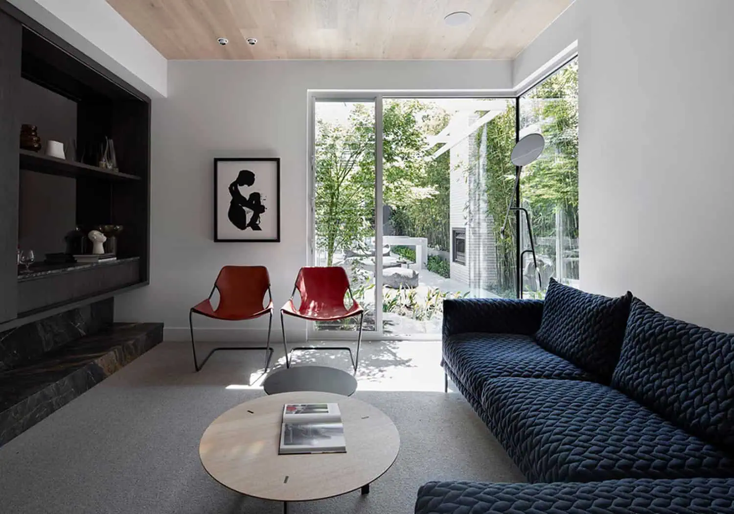 Colours and materials are matched inside and out, naturally blending the two and creating a seamless space. The entryway functions as a stylish drop zone for the entire family, forming the foundations of an impeccably organised home. Timber battens hide not one, but two secret doors. The sitting room, with its timber-clad ceiling, concealed entertainment system and built-in bar by TKDC, is the perfect setting for lazy Sundays or dinner party overflow.