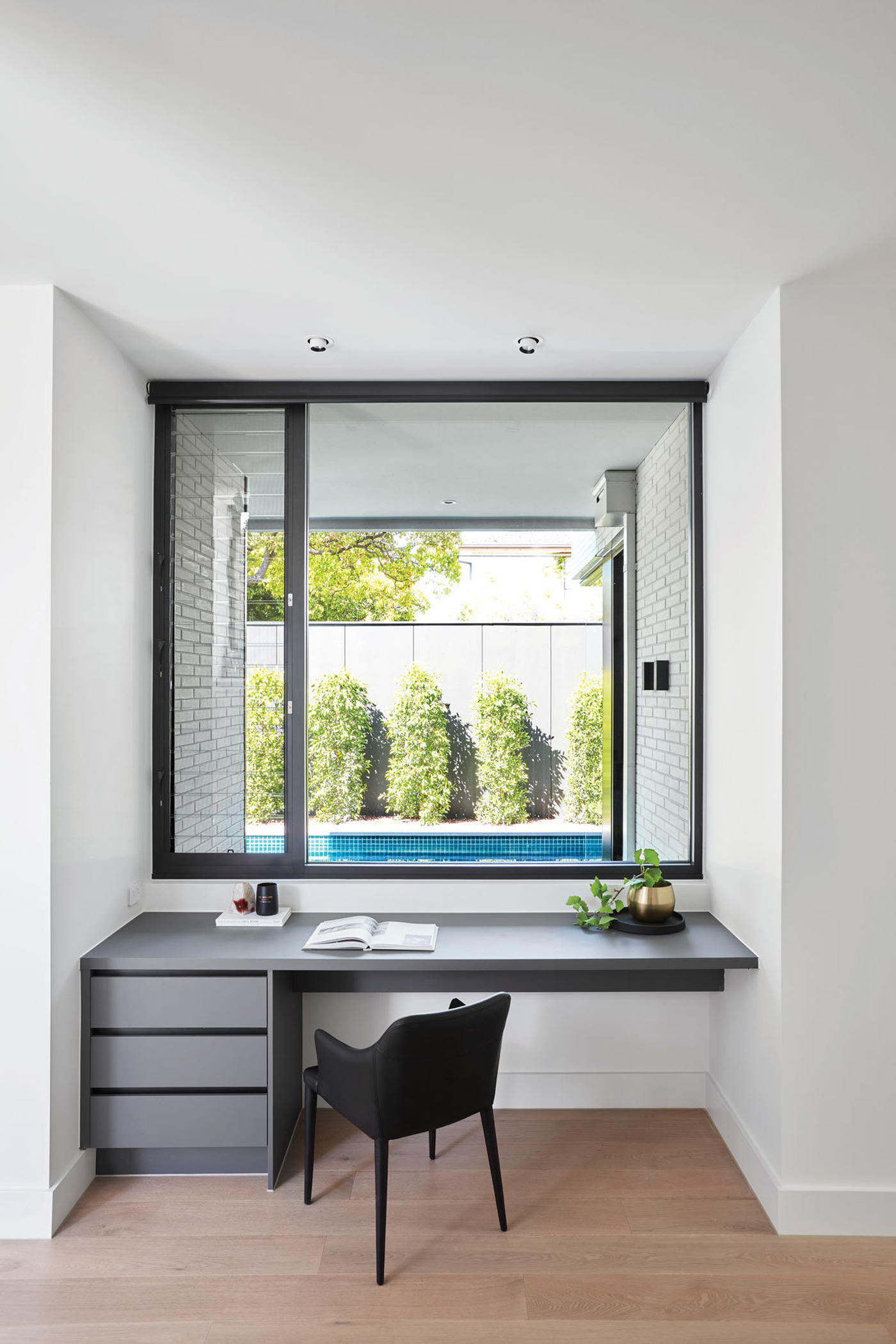 In the living room, The Kitchen Design Centre helped bring the idea of retreat to a luxe new level with moody joinery and built-in storage around the gas fireplace. There’s also custom cabinetry in the rumpus area, a stone-composite hearth, and a built-in study nook overlooking the manicured garden and swimming pool. An outdoor kitchen with built-in barbecue and waterfall-style stone benchtop is a highlight in the adjacent courtyard. The rooms are thoughtfully designed and considered, each contributing to the harmonious whole.