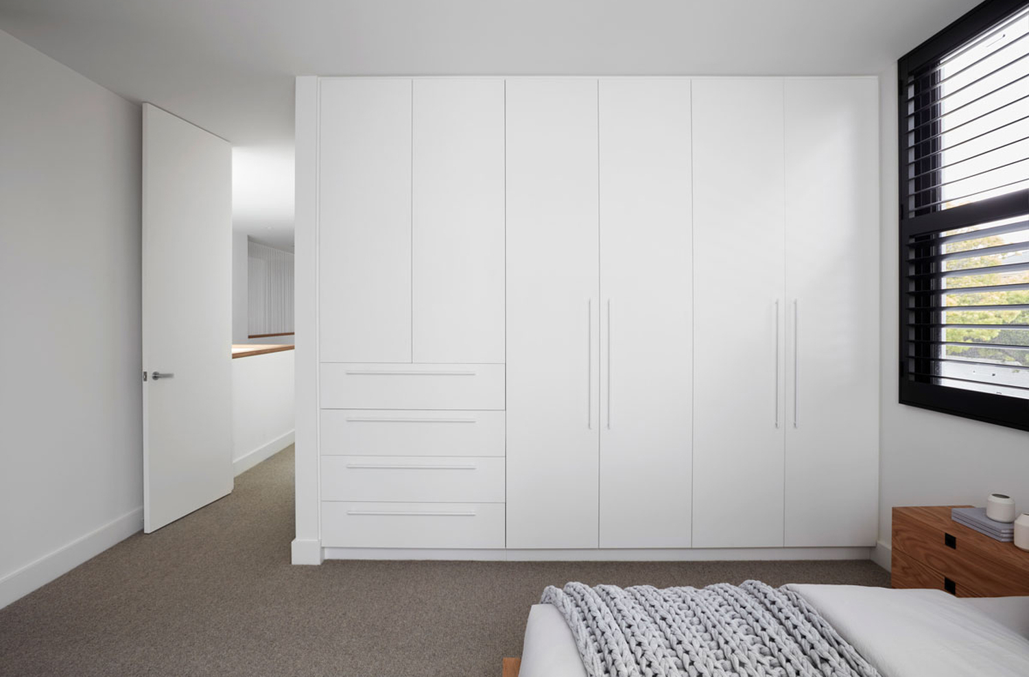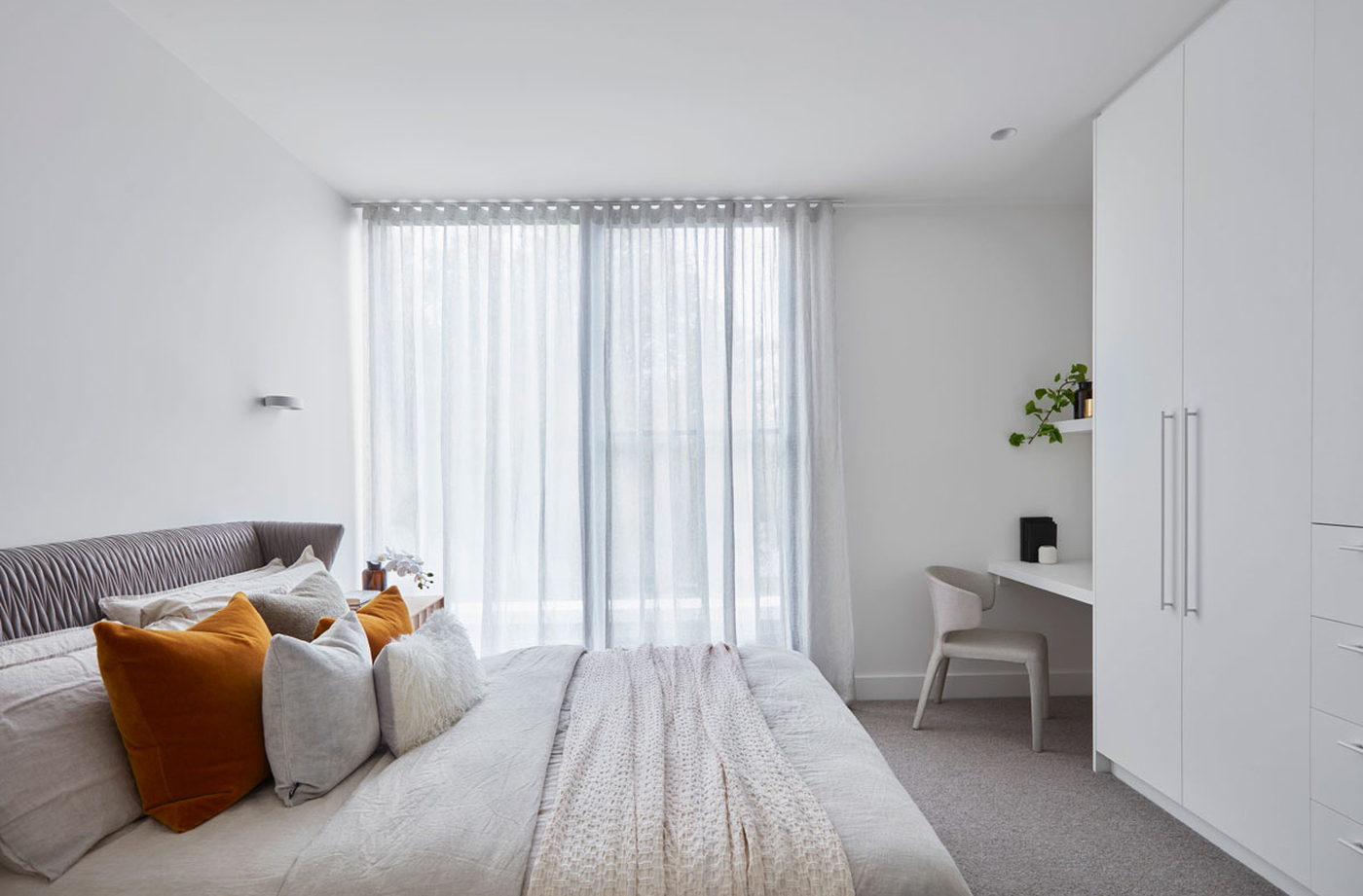 Moving through the space, you come to the kitchen, the beating heart of the home. A collaborative design between Webster Architecture and The Kitchen Design Centre, one of Mazzei Homes’ key partners, the striking kitchen includes all the elements and mod-cons you would expect of a luxury home. A leading name in the industry, The Kitchen Design Centre has been delivering outstanding custom kitchens and joinery since 1994. The entertainer’s kitchen also includes a butler’s kitchen/pantry with V-Zug appliances, integrated fridge and Italian marble benchtops. The piece de resistance is the island bench, which brings an element of texture to the materials palette. The V-ZUG wall oven is cradled by joinery in fingerprint-resistant Laminex Absolute Matte. Hafele tapware, Franke sinks and Blum soft-closing drawers round things out.