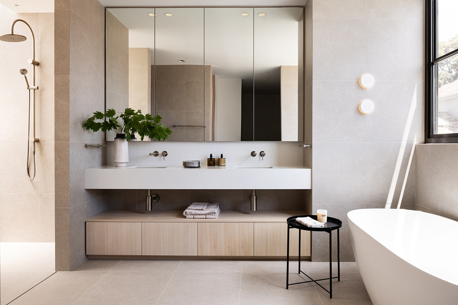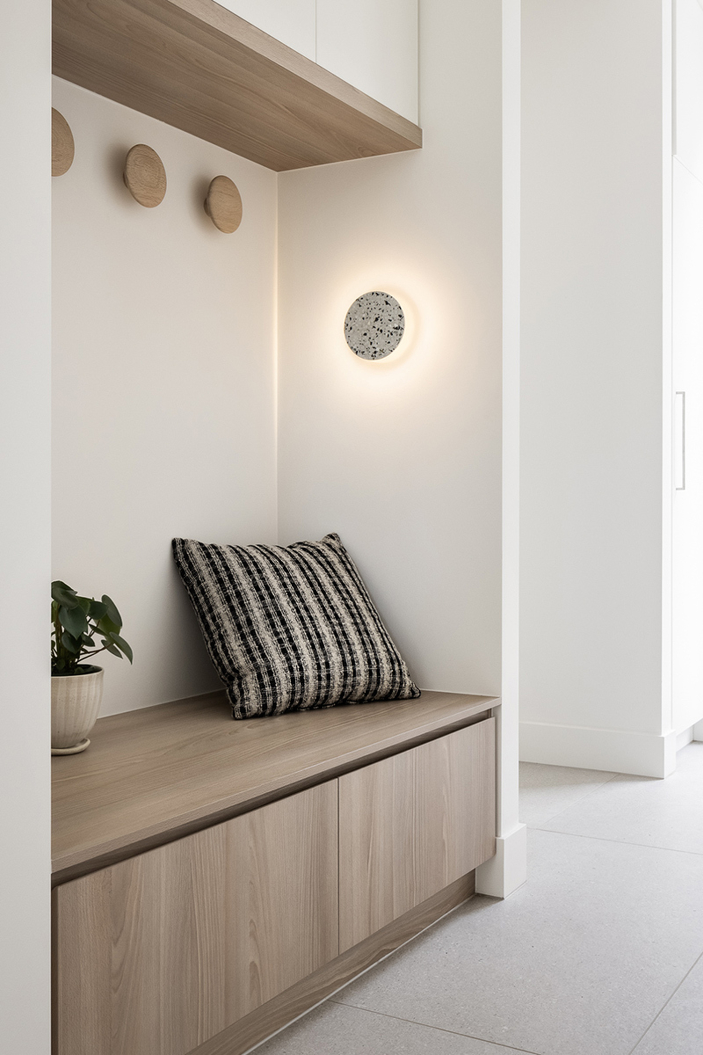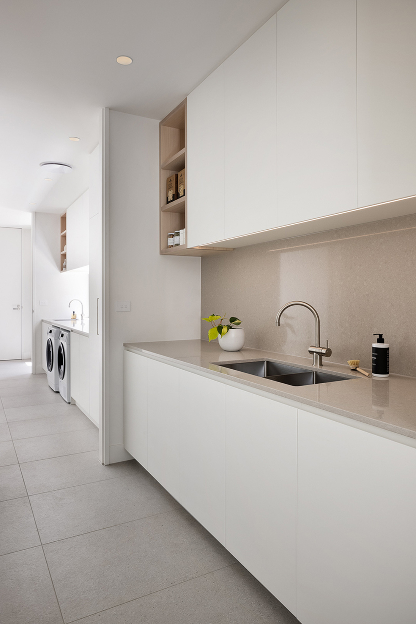 Into the butler’s pantry, there is an integrated fridge/freezer and ample work and storage space. A large laundry and mudroom complete the back-of-house utility zone that is designed to be kept highly organised with TKDC storage cabinetry and shelving.