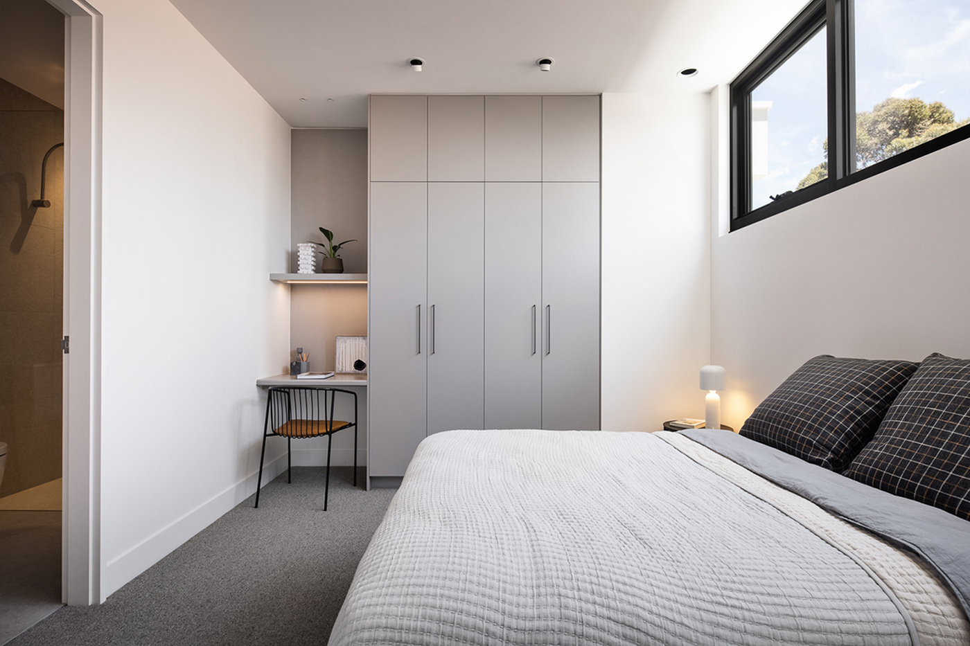 Upstairs is the lavish master bedroom, complete with hidden study, ensuite and WIR – just push on the timber wall panelling to reveal the joinery TKDC have built behind and throughout this beautiful home, including the additional two bedrooms, each with their own ensuite and built-in robes.